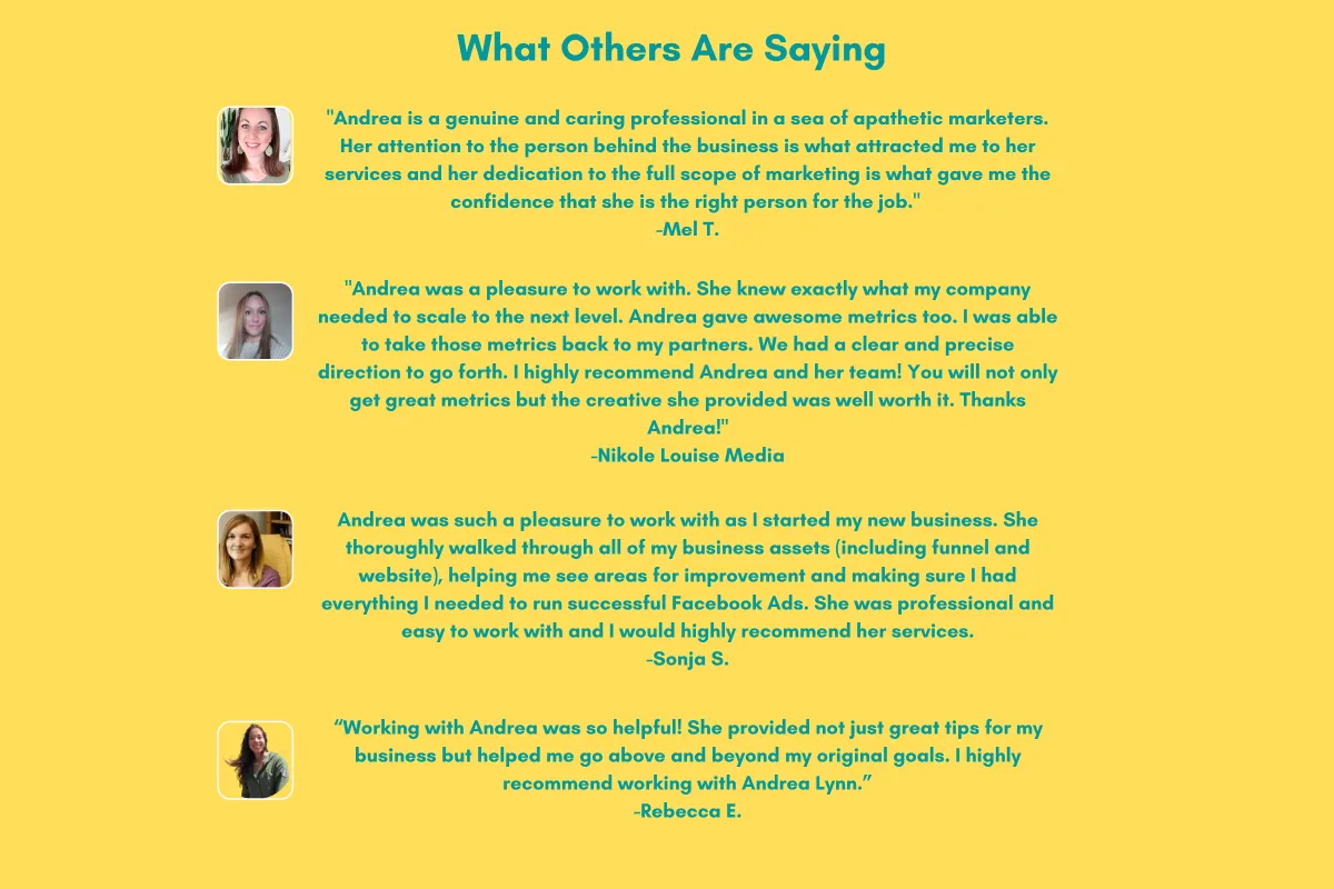 Please Note: Because of the performance-based nature of this service, we only take on 3 clients per month and carefully screen each client to ensure we can 100% deliver. To find out if we're a good fit, book a strategy call with the Lead Strategist, Andrea Lynn. Set up fee may apply if there is no product to market data or funnel in place.